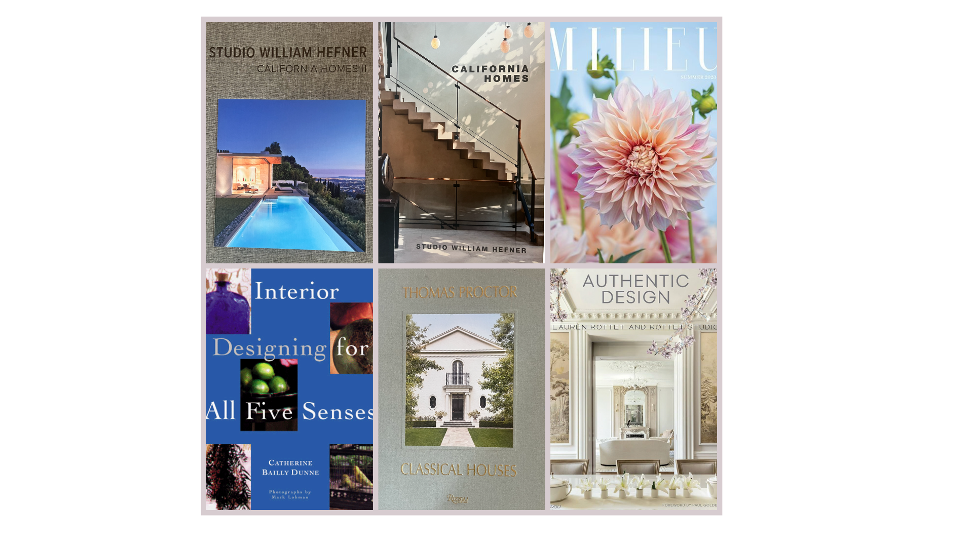 Her interiors have been featured in national magazines and architectural books, including the books California Homes I and California Homes II by Wiliam Hefner Studio, Authentic Design by Lauren Rotten, and Classic Homes by Thomas Proctor. They have earned her recognition as a leading voice in her field.